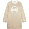 Vestido recto con capucha color arena manga larga y bolsos al frente . Logo estampado con pedrería dorada en el centro.