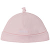 Gorro BOSS rosa pastel para bebé niña, tiene el logo Boss en un tono de rosa mas subido, y un moño blanco al frente